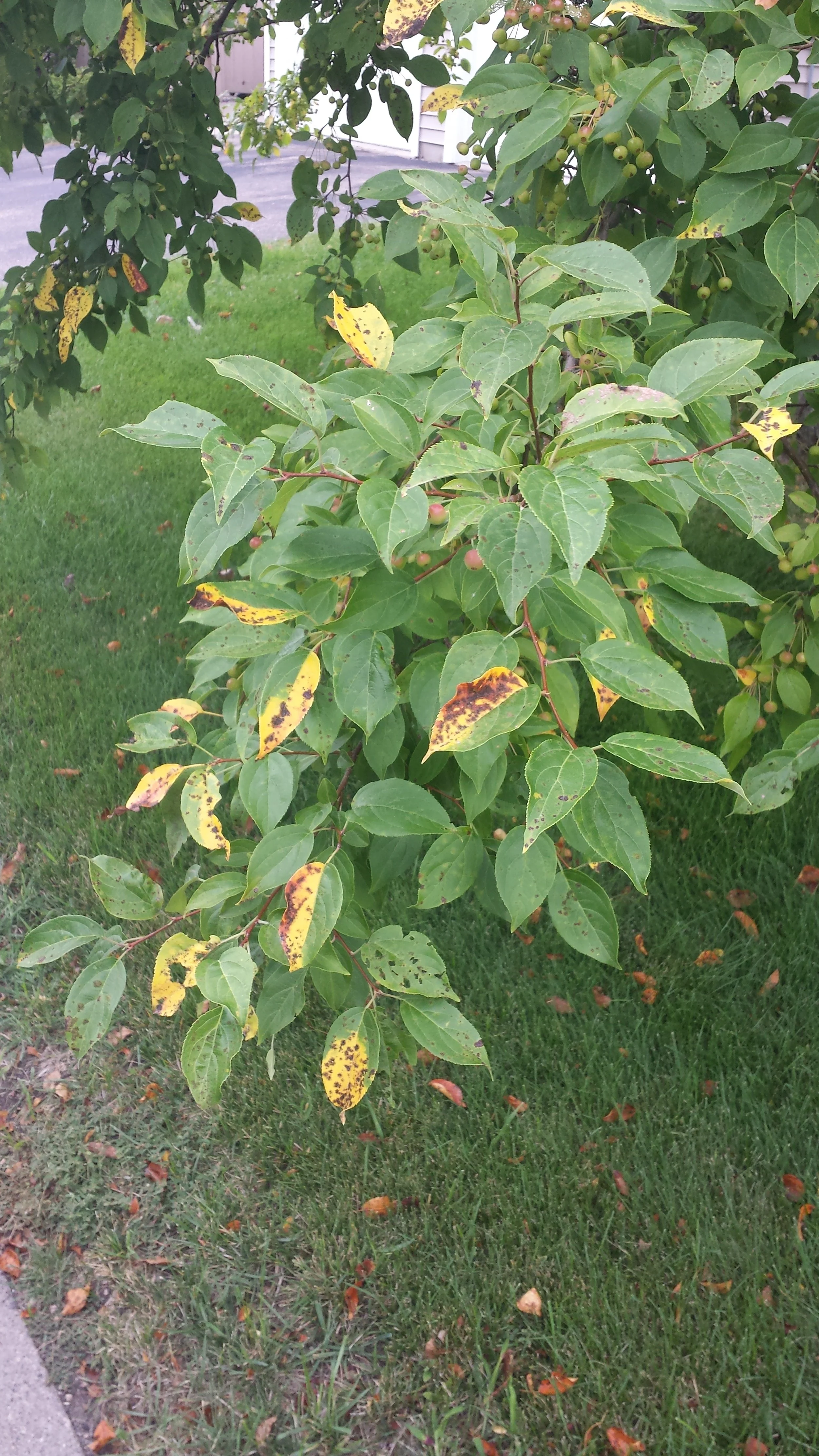 Picture showing early leaf drop and scattered yellow leaves throughout a crabapple tree (and lawn) in early June in Minnesota.